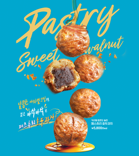 달콤한 카라멜 코팅으로 팝콘같이 바삭한 식감의 페스츄리 호두과자