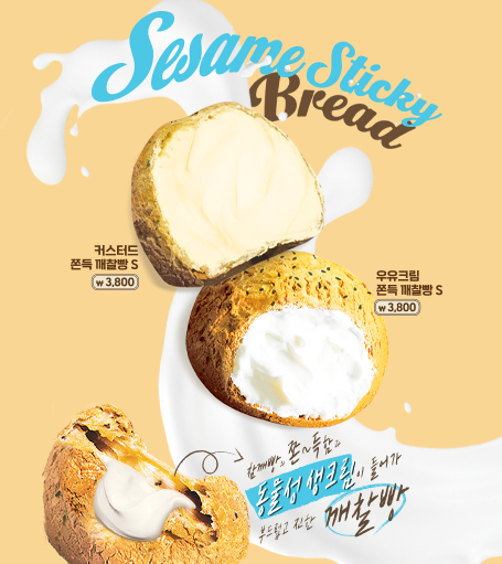 고소하고 쫀득한 깨찰빵 안에 진한 우유크림이 듬뿍 담겨있는 디저트