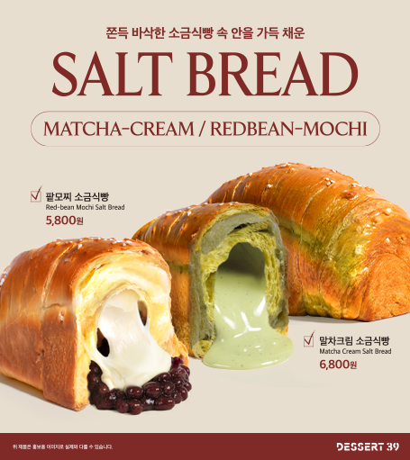 바삭한 소금식빵 속, 팥과 모찌를 넣어 쫀득한 식감과 바삭한 식감을 한 번에 느낄 수 있는 디저트