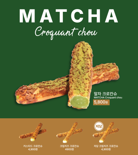 겉은 바삭하고 속은 국내산 말차 크림을 가득 채워 부드러운 프리미엄 크로칸 슈